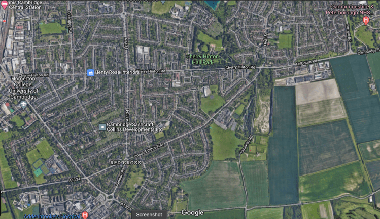 Above – land south of Cherry Hinton Road via G-Maps, predominantly Queen Edith’s Ward built in the latter half of the 20th Century. Most of the green spaces in this low-density ward are actually inaccessible to the general public. Furthermore, the housing density as with other parts of the city with a similar development is too low to sustain the sorts of institutions closer to the centre of town.