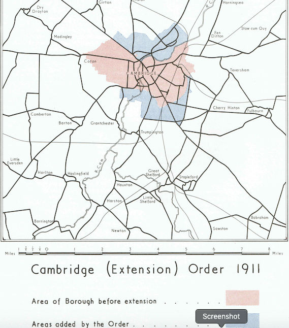 Cambridge’s story is told in this wonderful old publication from the 1950s on how the county and city boundaries changed. And Cambridge borough used to be very small indeed. It was only in 1911 that it started expanding properly on the back of a century of population growth that quadrupled the size of the town.