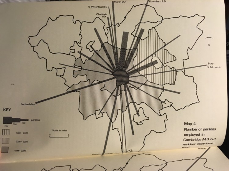 Item 4 is the most interesting one because if local government boundaries should match more closely local economies, then really the best thing to do is to start from scratch rather than accepting the boundaries of existing counties and relying on those councils to come up with the proposals. And previous rounds of local government reform have shown us what data sets need collecting and analysing to give us a picture of what local and regional economic geographies look like. The Parry Lewis Study from the 1970s of the Cambridge Sub-Region produced a number of charts that reflected an economic geography out of sync with the political and administrative boundaries and structures. The map below illustrates commuting into Cambridge.