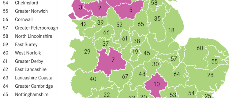Look further east of Cambridge and you see Norfolk separated into ‘Greater Norwich’ and I guess what is left of Norfolk after something has taken a chunk out of it. Yet Suffolk remains untouched.