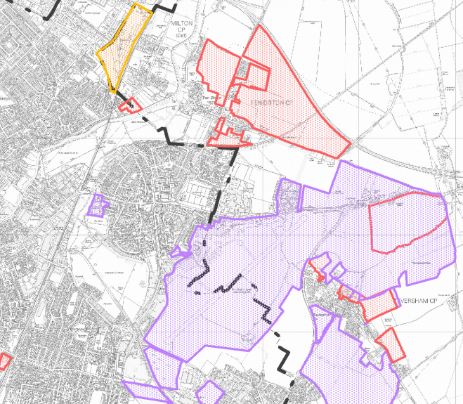 It’s worth noting that the big area of land highlighted in purple that covers the airport also includes some fields on the eastern side of Airport Way. If that got built on along with the other large purple plot on the bottom-right, that would effectively join up the villages of Cherry Hinton and Fen Ditton – or rather the council wards of Cherry Hinton and Abbey, along with the village of Teversham in South Cambridgeshire. This then makes the case for either expanding the city’s boundaries (or overhauling local government in the county) even stronger, as more of South Cambridgeshire bordering the City of Cambridge becomes suburban Cambridge rather than village Cambridgeshire.