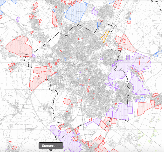 The above-mentioned map is from the Greater Cambridge Planning site here. The red blocks are sites suitable for residential only, purple for mixed, and blue for industry.