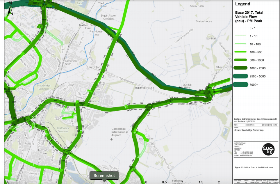From the analysis in the report above, we see a data map of traffic vehicle flows at the PM peak on major roads in East Cambridge. The A14 in thick dark green stands out. Zoom in and in the bottom left you can see Barnwell Road and in bright green, Mill Road.