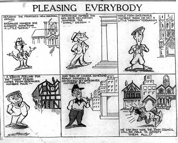 Don’t think the guildhall we got was a straight forward affair. It was incredibly controversial – as Sid Moon lampooned the whole thing in the early 1930s. The town could not unite behind an alternative design.