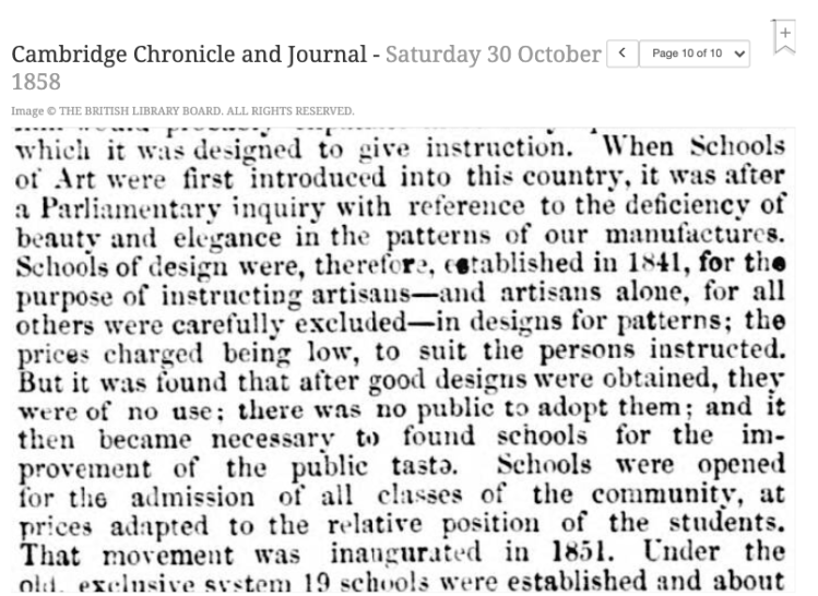 “When Schools of Art were first introduced to this country, it was after a Parliamentary inquiry with reference to the deficiency of beauty and elegance in the patterns of our manufactures. Schools of design were, therefore, established in 1841, for the purpose of instructing artisans – and artisans alone, for all others were carefully excluded – in designs for patterns the prices charged being low, to suit the persons instructed. But it was found that after good designs were obtained, they were of no use; there was no public to adopt them and it then became necessary to found schools for the improvement of public taste.”