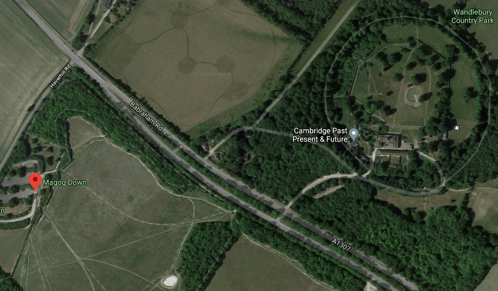 Below – a screenshot of Magog Down from G-Maps on the far left of the image, with Wandlebury Ring on the otherside of the very busy Cambridge-Haverhill road – one that desperately needs the rail link re-opening..