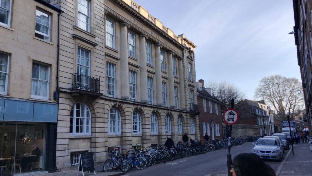 Note the thick red line is the historical boundary for Cambridgeshire. The shire level councils are all in different colours – hence “Cambridge County Council” for which County Hall was built and opened in 1913.