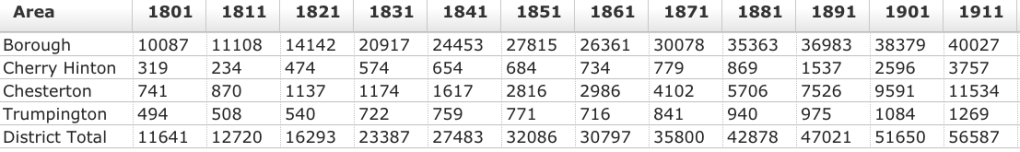 Note the above table reflects the separation of the borough from Cherry Hinton, Chesterton, and Trumpington, all of which were separate villages until the city’s expansion engulfed them.