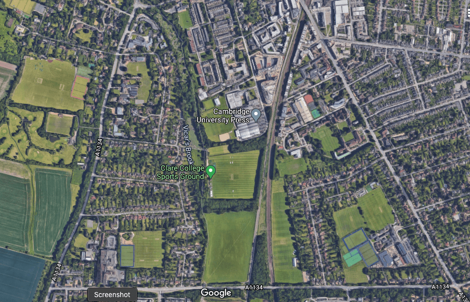 For example below is a screenshot of a part of South Cambridge – with Long Road at the foot of the image, and Hills Road bridge in the top right-ish corner.