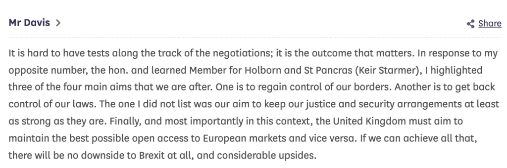 Above – the then Brexit Secretary Mr David Davis on “no downside to Brexit“.