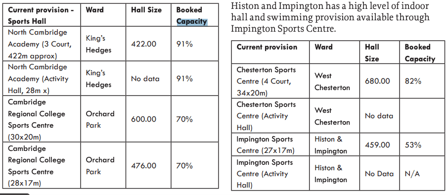 The North Cambridge Academy in King’s Hedges is another school that serves another historically economically less affluent ward. The Sport England recommendation of booked capacity is 80%. As the population continues to expand in and around the city, it is essential that additional capacity is included in new developments.