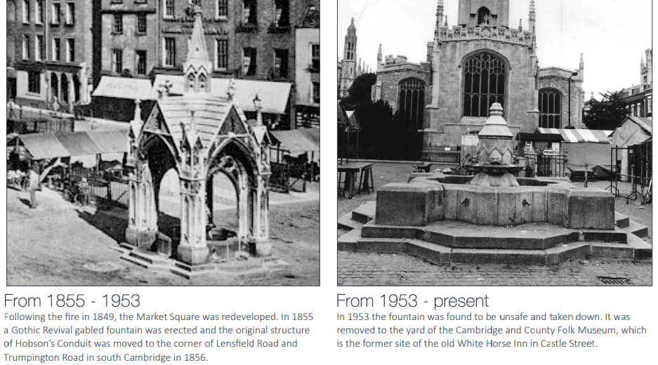 You can still see some of the statues from the old fountain at the Museum of Cambridge. A century of acid erosion, wear and tear rendered the structure unsafe, which was why it was removed.