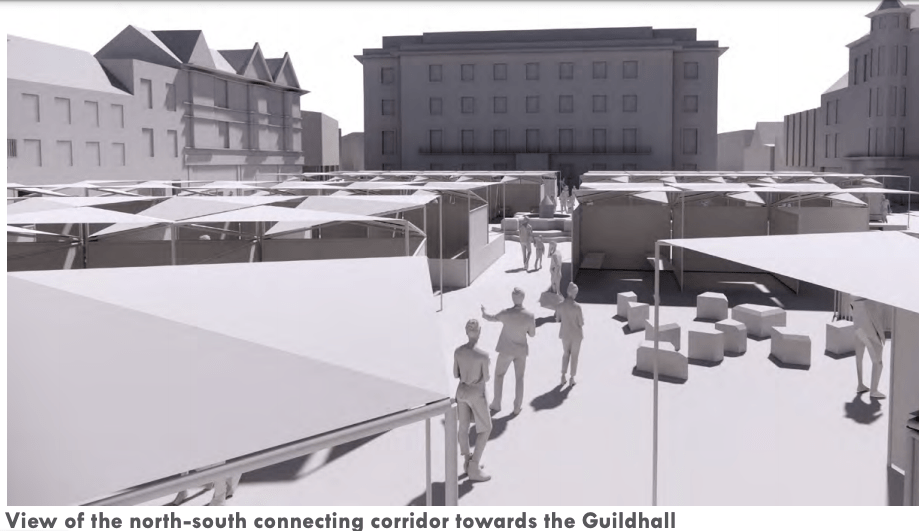 In principle it works for me. With Belcher’s Guildhall I’d go so far to suggest widening the north-south path between the stalls. But that won’t necessarily work for stallholders. And we must acknowledge this.
