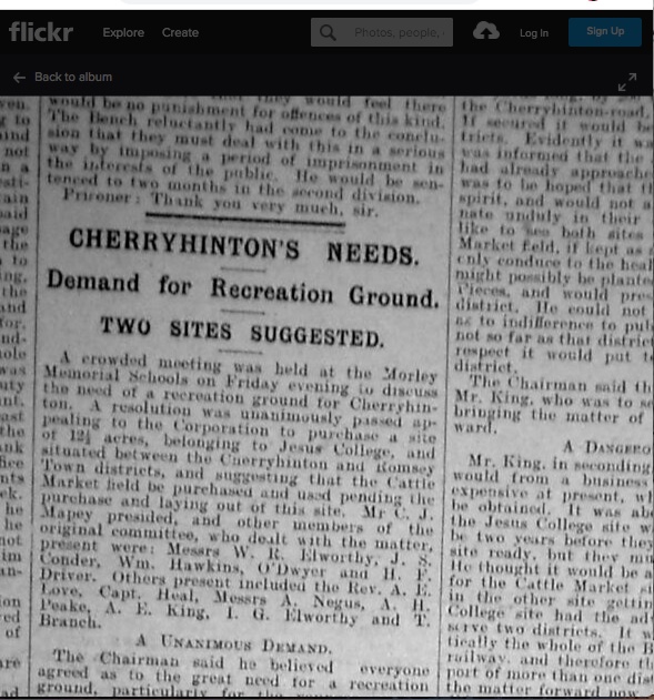 The meeting took place at Morley School, appealing for the Corporation of Cambridge (i.e. the City Council) to buy some of the land that was owned and being developed by Jesus College, to become open park land. In 1928, the park was opened.