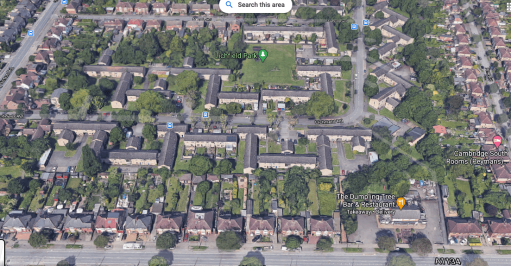 Several years ago the Liberal Democrats, when they controlled the City Council put together a plan to overhaul and redevelop the Lichfield Road flats – home to mainly elderly residents in council/social housing. Below – the Lichfield Rd flats looking westward, with Perne Road along the bottom of the picture. Lichfield Park (I’ve always known it as Neville Rd Rec) is where I sometimes film lockdown video monologues – when the place is not taped up!