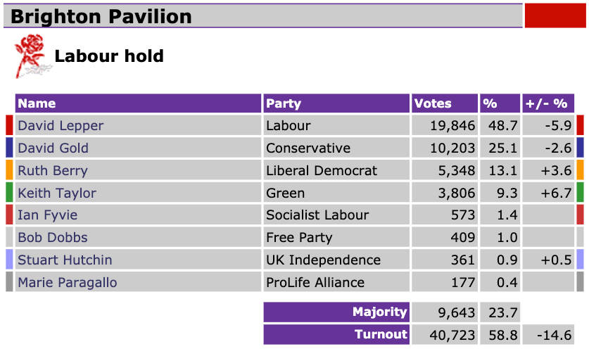 Accompanying the rise of the parliamentary votes for the Brighton & Hove Green Party, was their increase in councillor numbers. They now have 20 councillors – having recovered from their very difficult experience running a minority council in the early days of austerity where in 2015 their council numbers were more than halved. (You can see the electoral history here).
