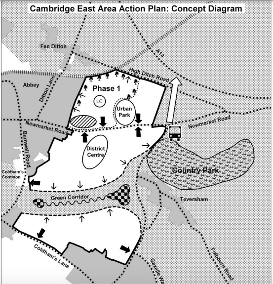 Above – dating from 2008, a conceptual vision of what East Cambridge could become, assuming the closure of Cambridge Airport. From the East Cambridge Action Plan.