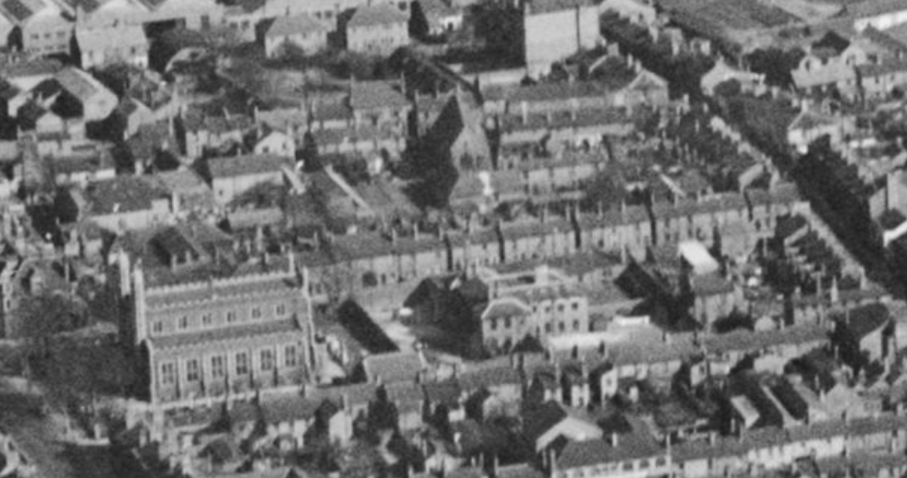 Above – Christ Church Cambridge on Newmarket Road, from Britain from above [EAW013079] in 1948. Most of the buildings to the right of it were demolished to make way for The Grafton Centre.