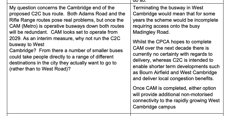 “Terminating the busway in West Cambridge would mean that for some years the scheme would be incomplete requiring access onto the busy Madingley Road. Whilst the CPCA hopes to complete CAM over the next decade there is currently no certainty with regards to delivery, whereas C2C is intended to enable shorter term developments such as Bourn Airfield and West Cambridge and deliver local congestion benefits. Once CAM is completed, either option will provide additional non-motorised connectivity to the rapidly growing West Cambridge campus.”
