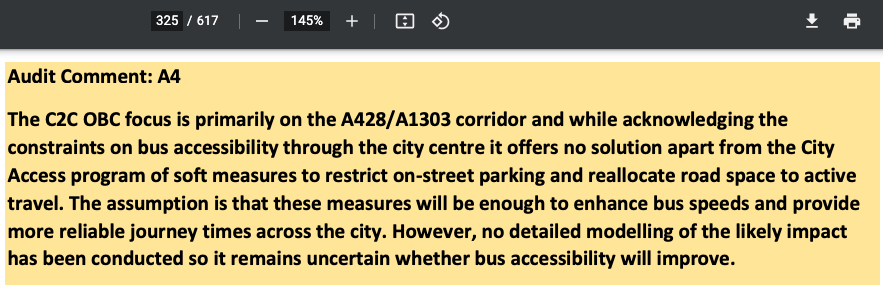 “[The Cambourne to Cambridge Busway Project] …offers no solution apart from the City Access program of soft measures to restrict on-street parking and reallocate road space to active travel. The assumption is that these measures will be enough to enhance bus speeds and provide more reliable journey times across the city. However, no detailed modelling of the likely impact has been conducted so it remains uncertain whether bus accessibility will improve.”