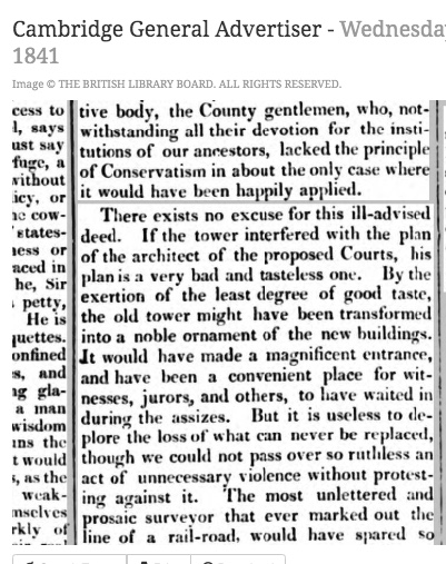 Above – The Cambridge General Advertiser lamenting the loss of the Castle Gatehouse