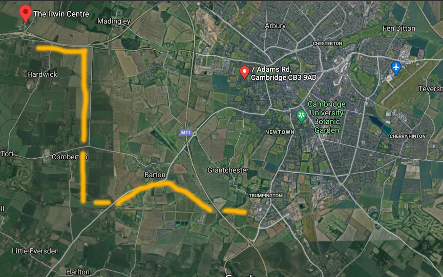 The very big challenge for the West Cambridge-Addenbrooke’s link (which involved all kinds of experimenting with bus lanes along the M11) is avoiding Grantchester Meadows. There’s a reason why the M11 is as far away as it is – and even then it’s too close with the traffic noise spoiling everything.