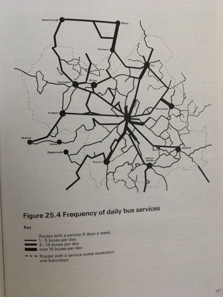 Above – Bus frequencies mapped by Prof John Parry Lewis in his expensive and ultimately abandoned plan for Greater Cambridge in the 1970s – which would have seen the City double in size to over 200,000 people.