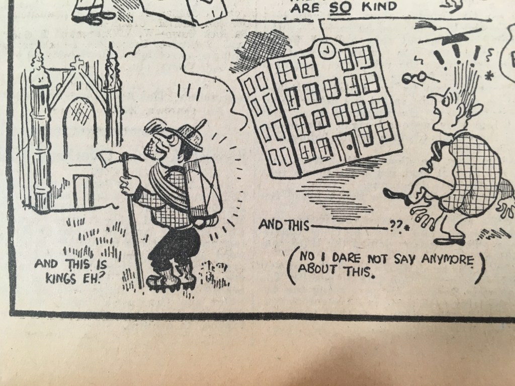 Ronald Searle lampooning the unpopular Guildhall design – hated by many in the 1930s. From the Cambridge Daily News 03 Oct 1936, in the Cambridgeshire Collection.