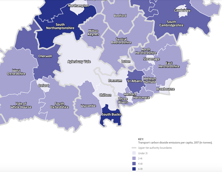 Basically the darker, the higher the CO2 emissions. Note the difference between Cambridge & South Cambridgeshire – and the pattern of urban areas having lower footprints. Then think of the 15 minute city concept, and what improvements to our market town infrastructure is needed to deliver them that does not involve driving to out-of-town supermarkets, or long commutes to work.