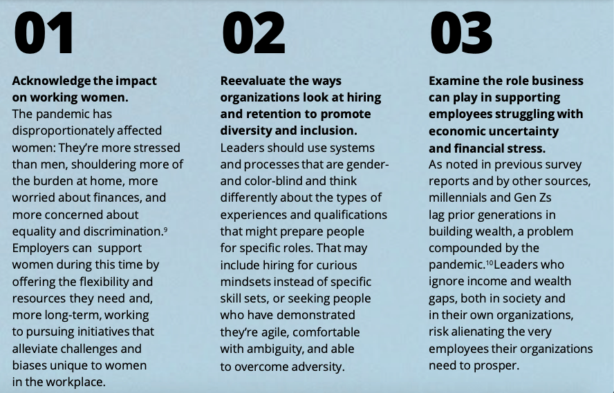 - Acknowledge the disproportionate impact the pandemic has had on women