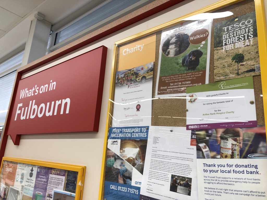 I remember inquiring at one of the large Tescos in/around Cambridge about putting large notice boards up. At the time they only had one of those boards that took A6-sized note cards. The one up at Fulbourn (note this one has been curiously ad-busted by environmentalists!) now has space, and is routinely used by community groups, but not by the local public sector when for events it really could be.