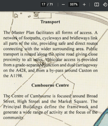 Above – no mention of rail or light-rail mass transit. The big assumption is that there will be sufficient bus transport. Which in the face of austerity has turned out to be a very big assumption. We are reassured though that the Centre of Cambourne is focused around a Market Square.