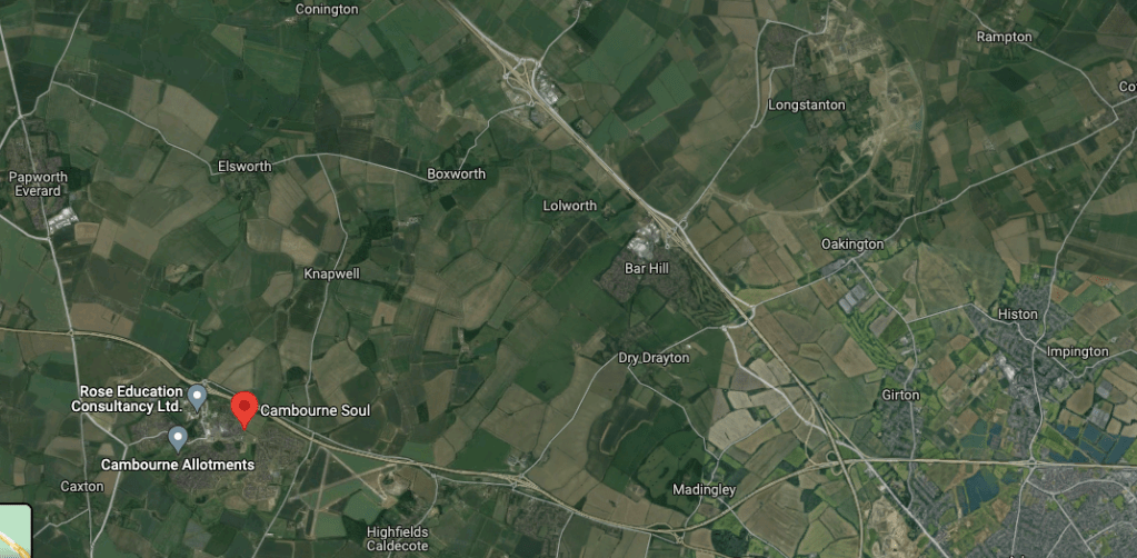 Above – from G-Maps here. Cambourne is bottom-left, Bar Hill in the middle (1960s large village), and Northstowe just to the east of Longstanton.