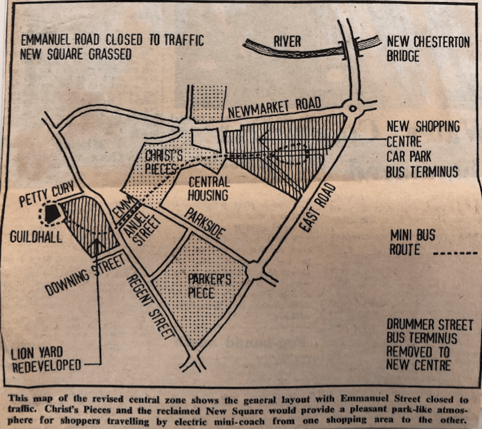 “In the Exhibition you will see our suggestions for its use mainly as an extension of the civic area, and I would stress the point that the University has already offered to meet half the cost of a new public hall in the Lion Yard for joint City and University Use. Such a hall would, I believe make a great contribution to the life of Cambridge”