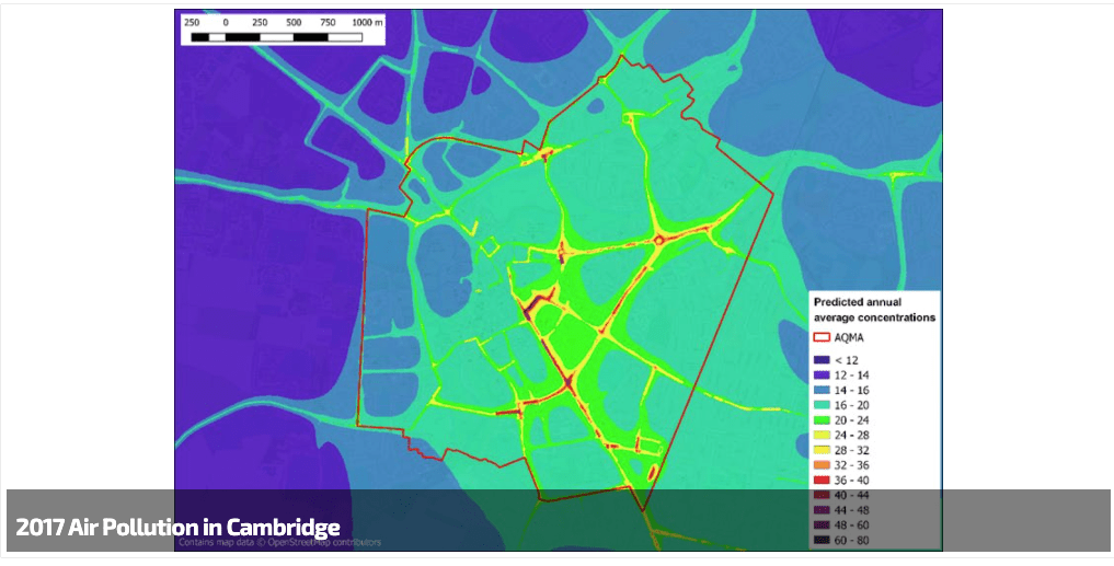 “Particulate matter levels in parts of Cambridge are above the [World Health Organisation] WHO guideline values, but below the UK National Air Quality Objectives.”