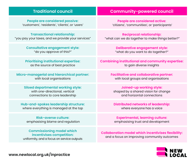 Above – from Becoming a Community-Powered Council, by Kaye & Pollard. How many of the alternatives in the pink column could apply to other institutions beyond local government?
