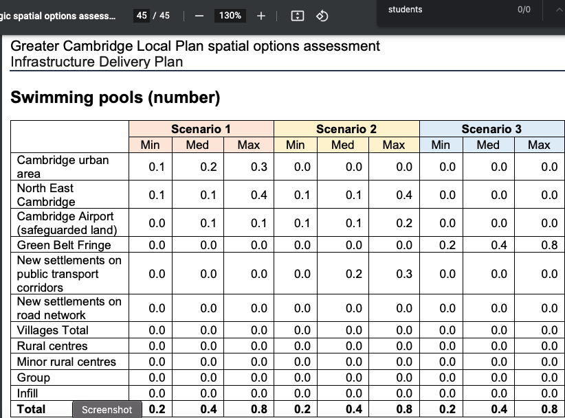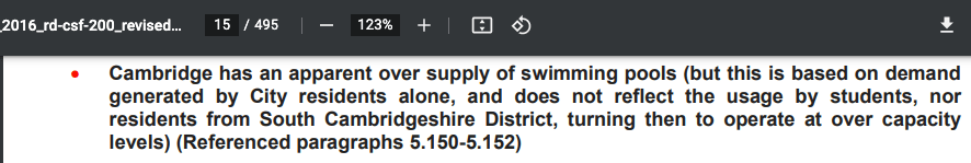 Furthermore at 1.7 the report states only two private pools (DW which is small, David Lloyd which is large but requires expensive subscriptions) and Frank Lee (for Addenbrooke’s workers only) have any spare capacity.