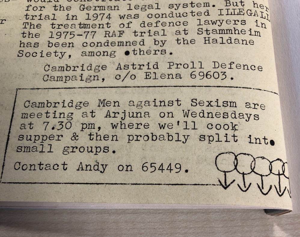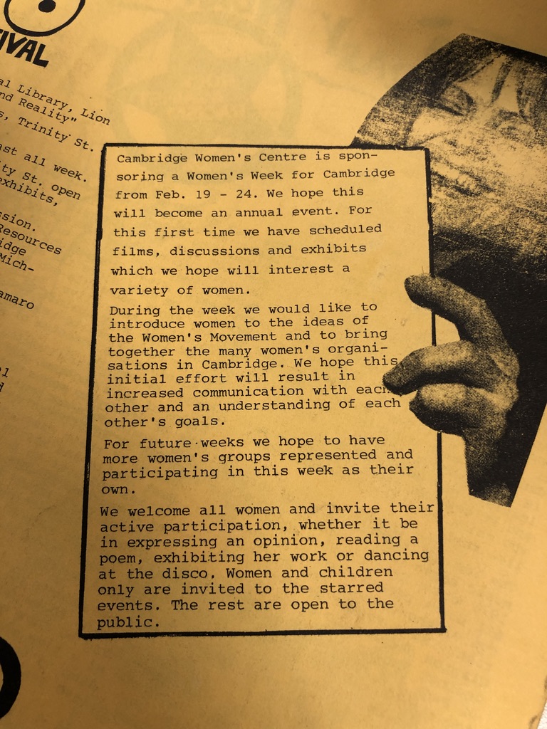 The depressing state of violence against women remains a high profile political issue – not least because of Westminster’s repeated failures to get a grip of the problem, made worse by the repeated unwillingness of social media firms to deal with the online abuse. The campaigns in The Kite reflect the huge – and perhaps even greater barriers that women faced, from institutionalised discrimination in the workplace through to the social and cultural stigma against single mothers. It’s noticeable that Cambridge had a Gingerbread Group for single parents as well as an active LGBTQ support network mindful that the decriminalisation of homosexuality had only been passed by Parliament in the decade before. In the face of all of this, the Women’s Week festival must have been a significant event.