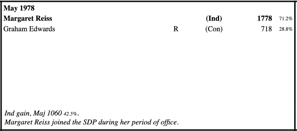 Cllr Margaret Reiss (Ind – Market) took on the Conservatives over their policies on The Kite – and won. Up until 1970 the ward had been a solid Tory seat. As the results from Keith Edkins below shows, Mrs Reiss overturned the majority of incumbent Graham Edwards.