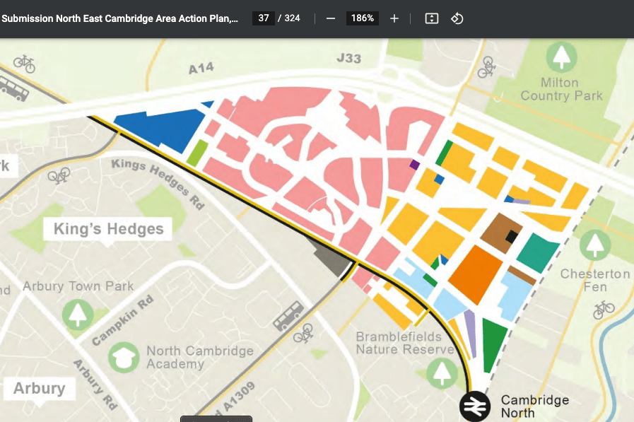 The proposal is for 75 new homes. Laudable but not without its problems. The main ones are noise and traffic. There is Milton Road – the A1309 which will have regular bus services going past north-south, alongside the guided busway buses going east to west. The Green End Road / King’s Hedges Road / Milton Road junction is a very busy one, and you have to combine that with the traffic going into and out of the Science Park. Therefore the mitigation for noise and pollution will have to be significant. Given the relatively few number of houses compared to the rest of the development, far better to have that site being used for something that can take advantage of the public transport and active travel links, and provide a much-needed facility for a part of Cambridge that actually has very few district-level facilities and amenities.