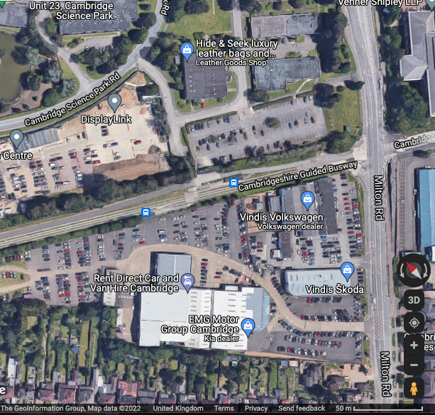 Above – a side-by-side comparison of Parkside Pool (L – red balloon icon) in Cambridge with the motor garage firms on the existing Milton Road site – note the amount of car parking space with the latter. Note as well the 50m scale at the bottom.
