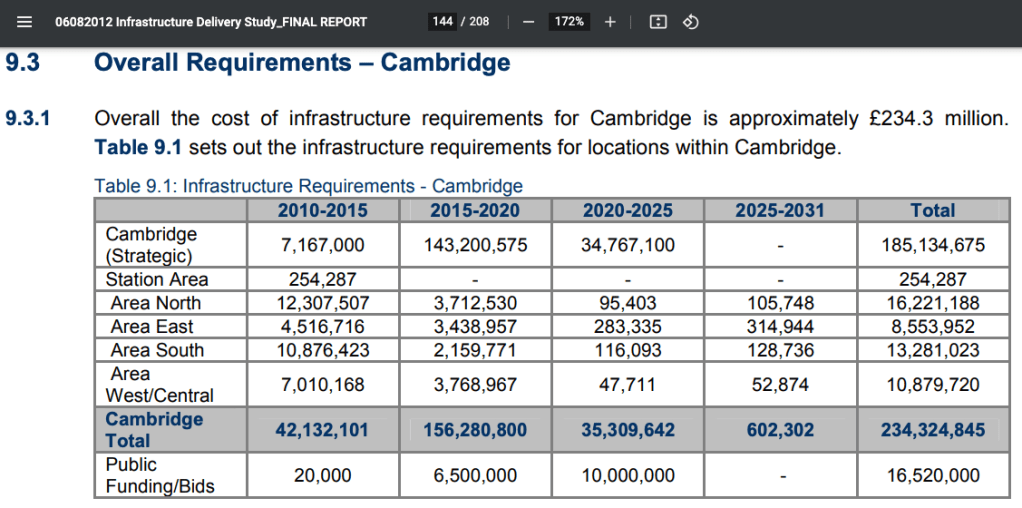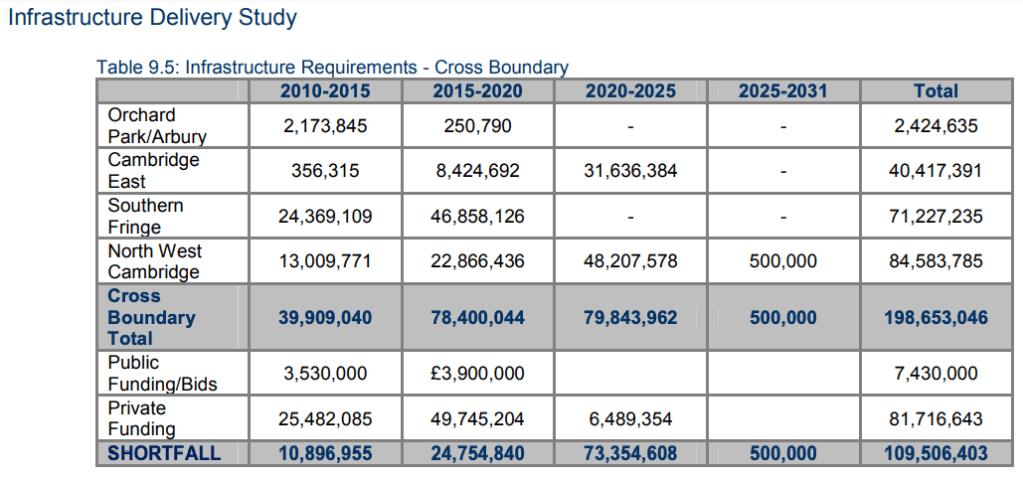 In 2012 Cambridge City Council & South Cambridgeshire District Council commissioned Peter Brett Associates LLP to produce an Infrastructure Delivery Study. You can read both the executive summary and the full report from the papers here from 11 Sept 2012.