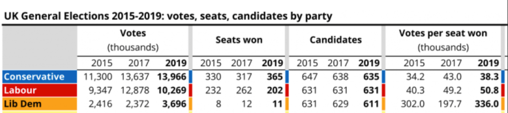 It was particularly tough for the Liberal Democrats in 2019, over a million extra votes converting into *fewer seats* than they won in 2017 and fewer than they went into the 2019 general election with.