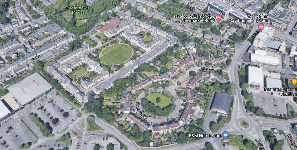 PYE was once one of the biggest employers in the city, and you can find out about their history in the Museum of Technology. This photograph illustrates how development styles, economic pressures, and social values changed over time. The roundabout at the bottom-right is Coldham’s Lane / Asda / Beehive Centre junction.