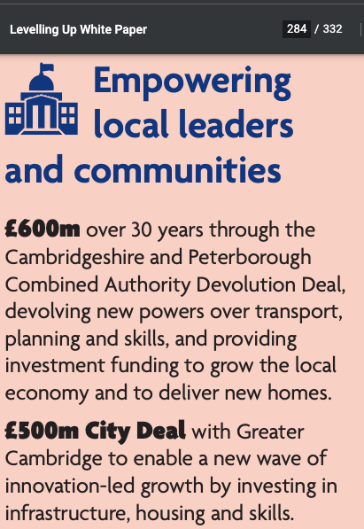 Above – Michael Gove’s new Levelling Up Paper tells local residents in “Greater Cambridge” – presumably defined as the geographical areas covered by Cambridge City Council & South Cambridgeshire District Council, ’empowers local leaders and communities.