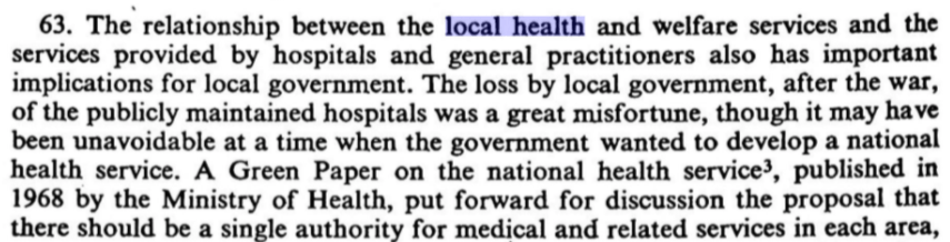 This was something the Royal Commission 1966-69 addressed. It acknowledged the mass transfer of local hospitals as part of founding the National Health Service had huge implications for local councils.