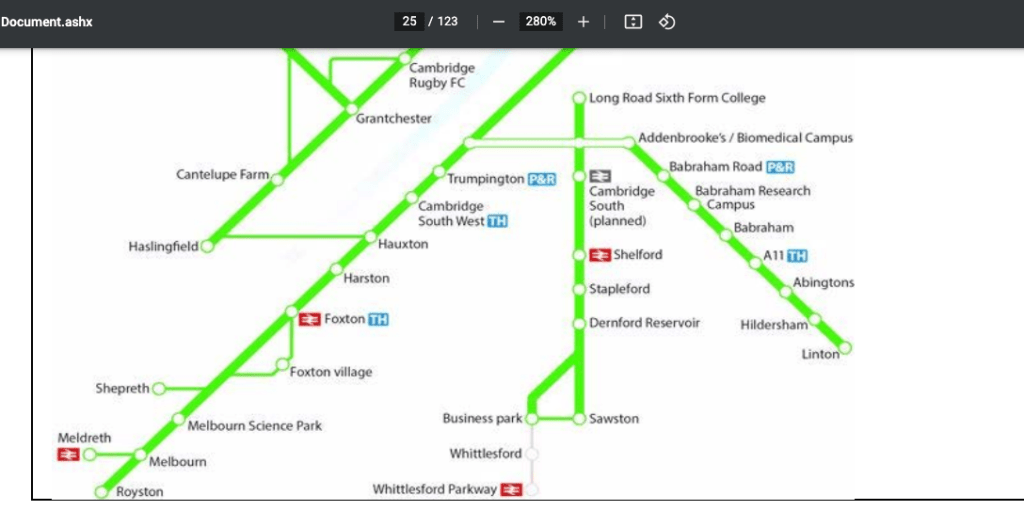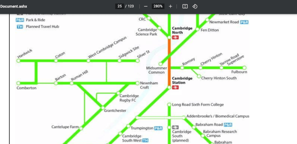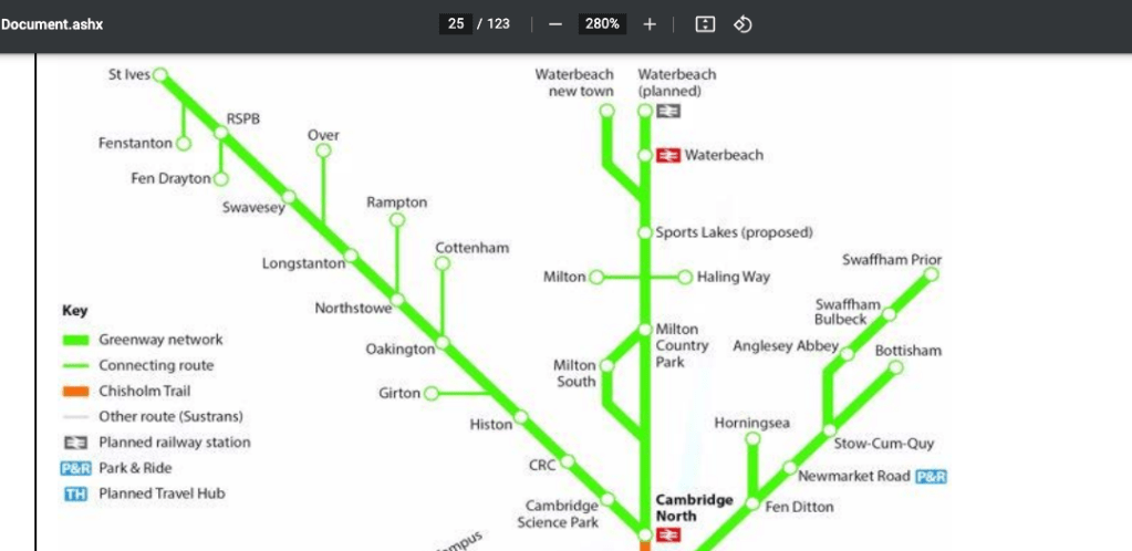 Above – note the long planned for Cambridge Sports Lake is incorporated, along with the much-needed eastward links out to Bottisham and the Swaffhams, that could do with major improvements.