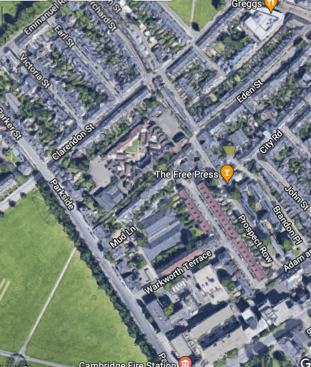 The group of buildings between Clarendon Street, Parkside, and the Free Press pub is where the existing Parkside Community College is. The green is Parker’s Piece – where the students do P.E. But it comes with the inevitable hazards of using city centre parks.