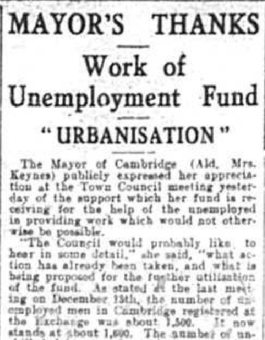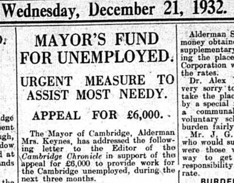 Mayor Florence Ada Keynes established an unemployment fund in Cambridge at the height of the Great Depression during her mayoralty.