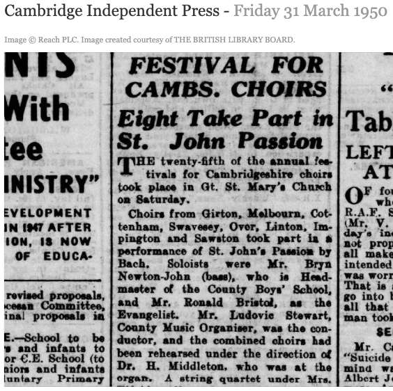 Since my most recent blogposts on Newton-John Sr, I’ve found out a little more about the late Professor and former RAF Wing Commander who demobilised in 1945 to take up the post as Headmaster of the Cambridgeshire County High School for Boys – today’s Hills Road Sixth Form College. One was on his record of organising local music groups in and around Cambridge – such as one featuring Histon and Impington’s in the British Newspaper Archive. When I think of his emigration – driven as much by a last ditch attempt to save his failing marriage, I also think about what Cambridge lost not just in terms of a head teacher, but also a musician, an administrator, and a civic activist – for he was also a Cambridge Rotarian and a baritone at St John The Evangelist on Hills Road, opposite Homerton College.